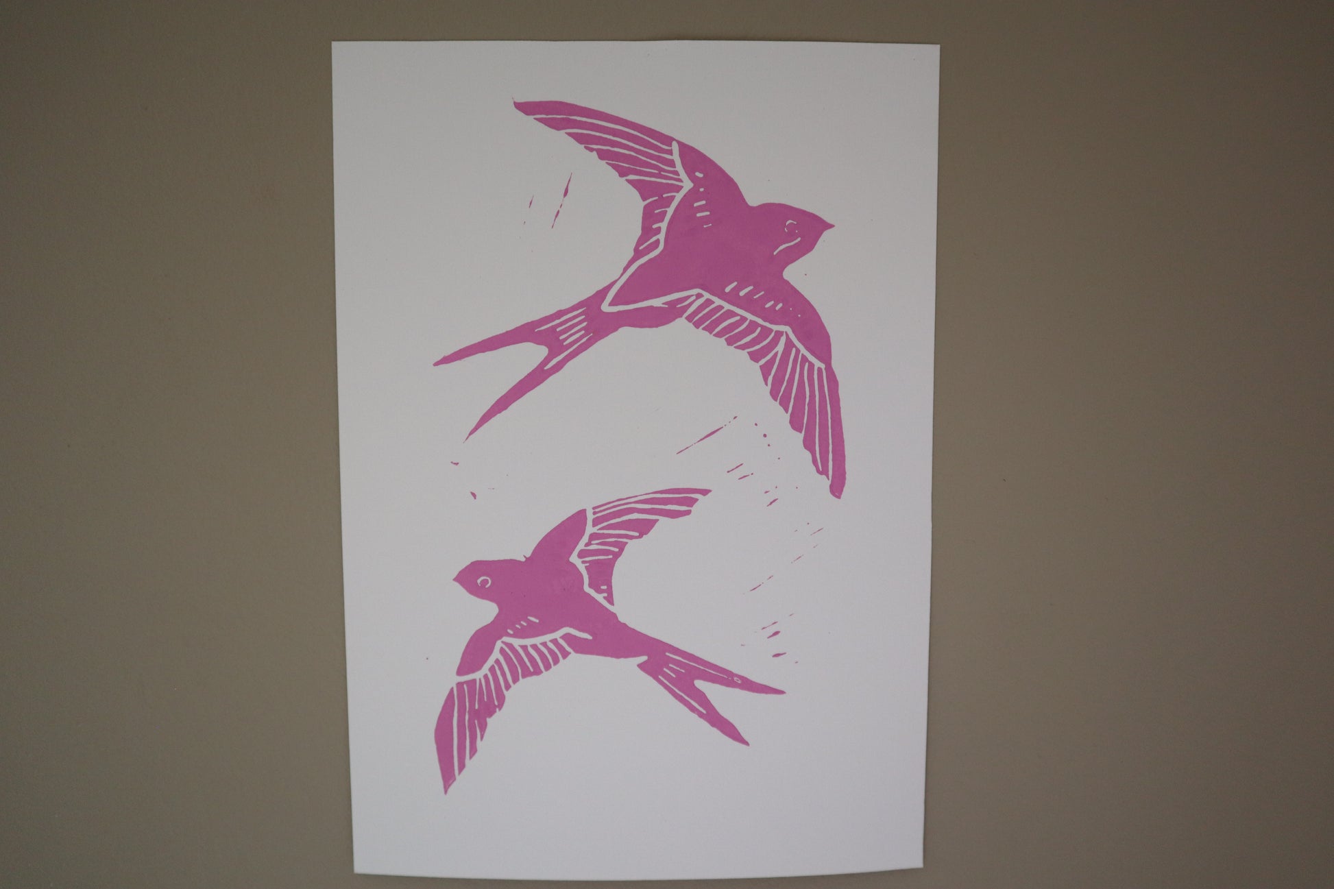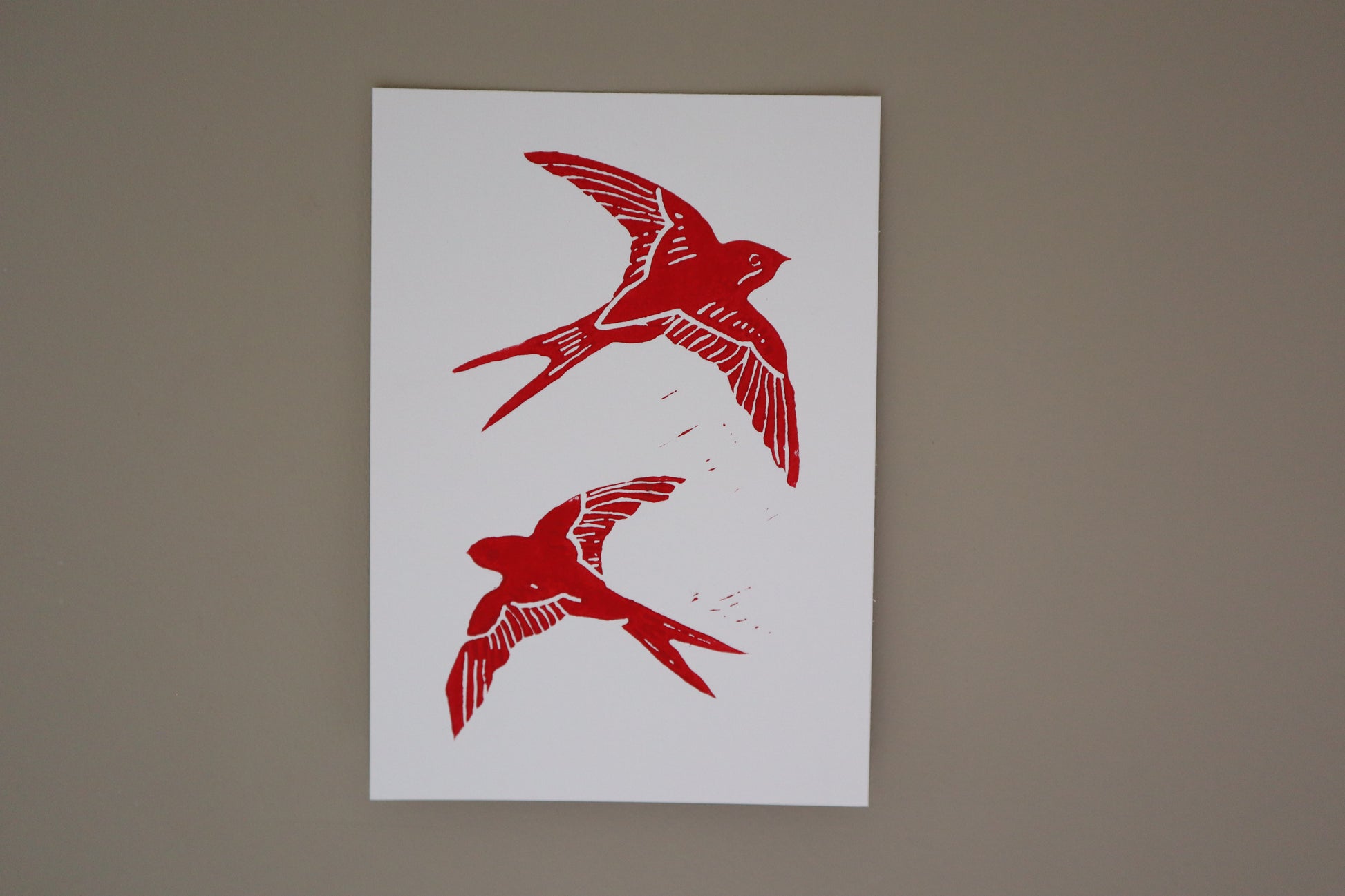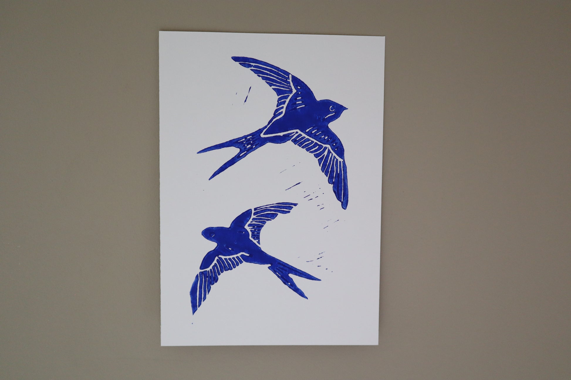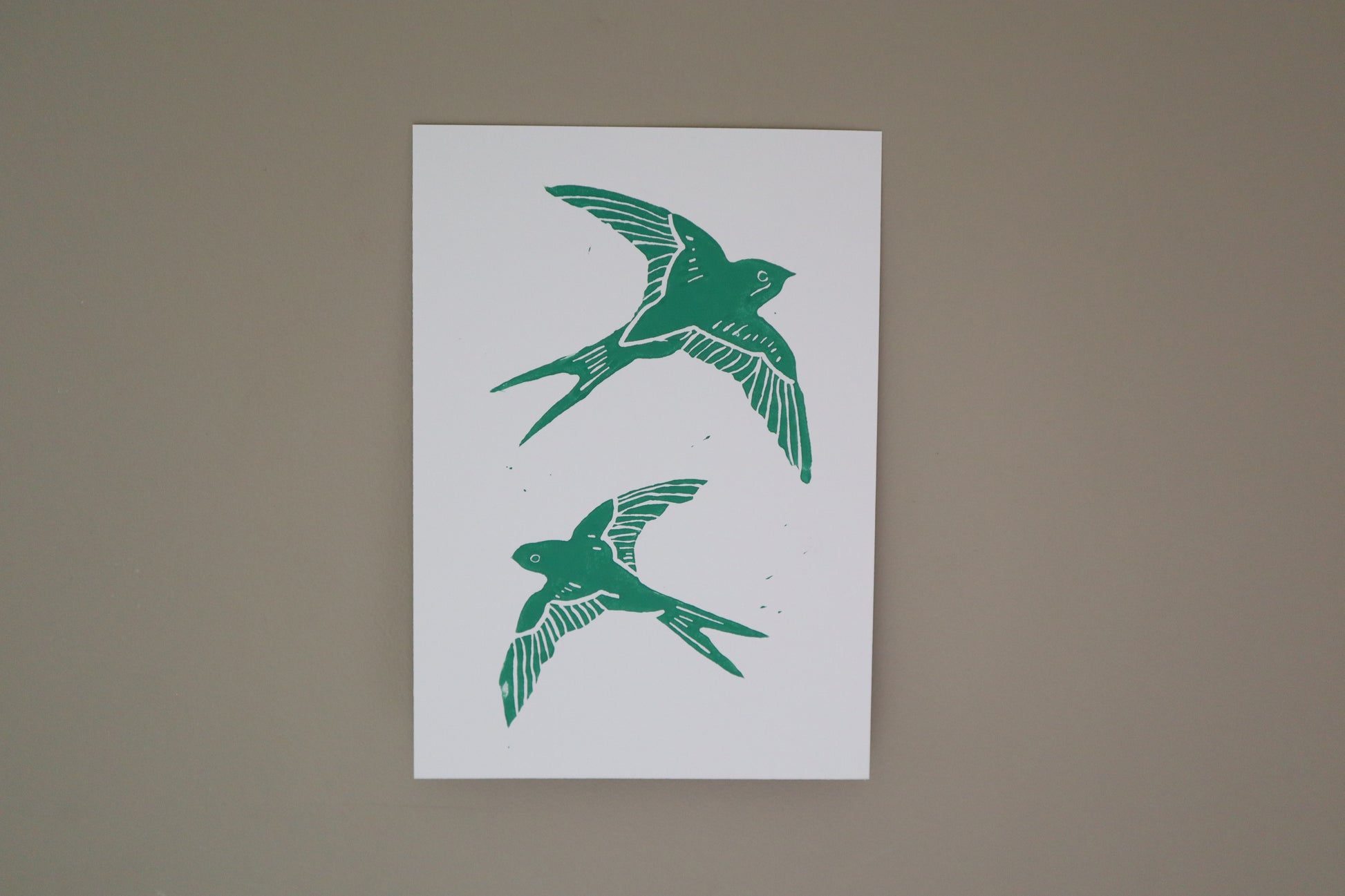 Mine små linoleumstryk er lavet i A5-størrelse – perfekte til at hænge op som vægpynt, eller til at bruge som et særligt postkort eller fødselsdagskort, når du vil give noget helt unikt.