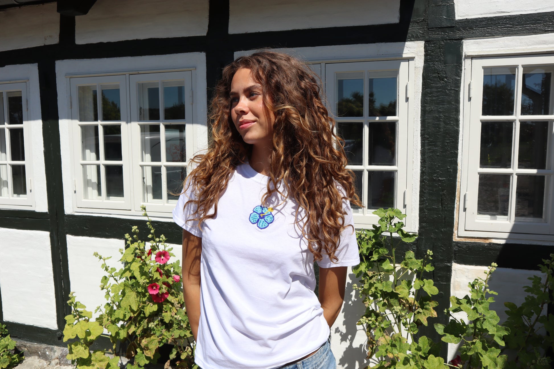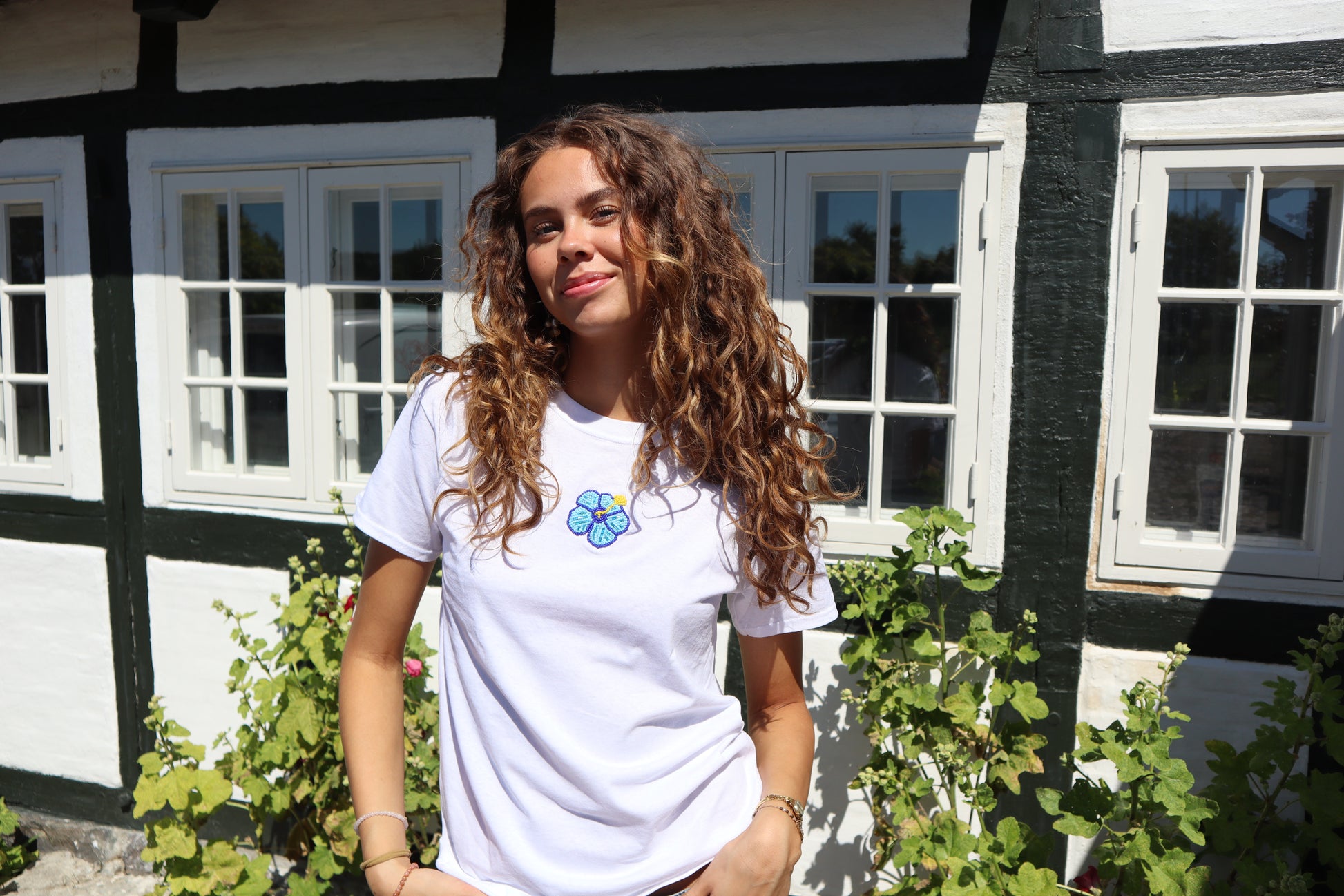 Hawaii blomst håndbroderet. Hver enkel perle er sirligt broderet på<3